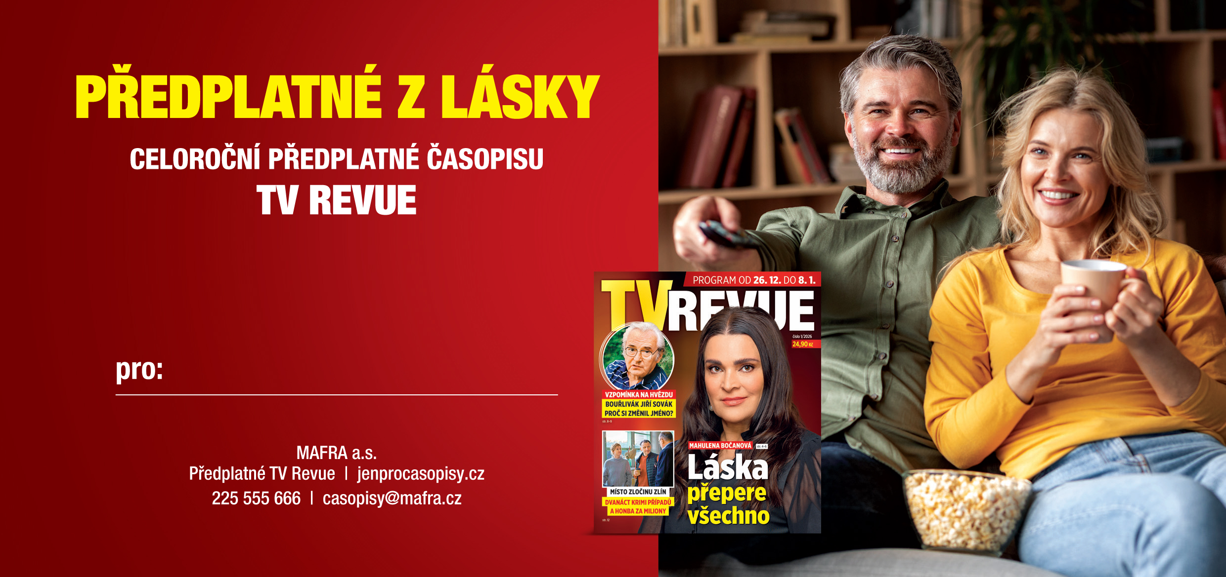 Chtěli byste překvapit svou drahou polovičku praktickým a milým dárkem? Předplatným časopisu TV REVUE potěšíte na celý rok každého milovníka televize!